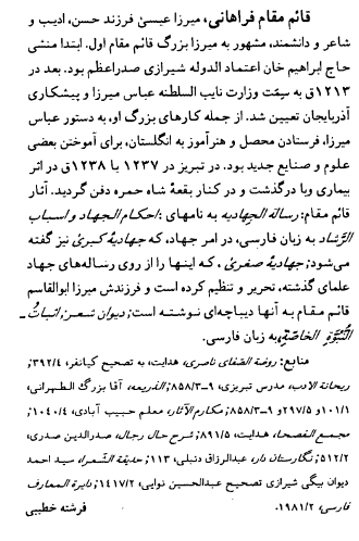 Abstract: قائم مقام فراهانی میرزا عیسی فرزند حسن ادیب و شاعر و دانشمند، مشهور به میرزا بزرگ قائم مقام اول، ابتدا منشی حاج ابراهیم خان اعتماد الدوله شیرازی صدر اعظم بود. بعد در ۱۲۱۳ ق به سمت وزارت نایب السلطنه عباس میرزا و پیشکاری آذربایجان تعیین شد. از جمله کارهای بزرگ او به دستور عباس میرزا، فرستادن محصل و هنر آموز به انگلستان برای آموختن بعضی علوم و صنایع جدید بود در تبریز در ۱۲۳۷ یا ۱۲۳۸ ق در اثر بیماری و با درگذشت و در کنار بقعه شاه حمره دفن گردید. آثار قائم مقام: رسالة الجهادیه به نامهای احكام الجهاد و اسباب الرشاد به زبان فارسی در امر جهاد که جهادیه کبری نیز گفته می شود جهادیه صغری که اینها را از روی رساله های جهاد علمای گذشته تحریر و تنظیم کرده است و فرزندش مبرزا ابوالقاسم قائم مقام به آنها دیباچه ای نوشته است دیوان شعر؛ اثبات النبوة الخاصة به زبان فارسی