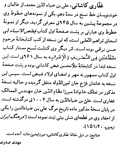 Abstract: غفاری کاشانی، علی بن ضیاء الدین محمد، از عالمان و خوشنویسان خط نسخ در سده دهم. یکی از نمونه های خطوط وی در مجموعه پیشین به سال ۹۴۵ ق معرفی گردید. دیگر از نمونه خطوط وی عبارتی بر پشت صفحه اول کتاب قصص الانبياء أبي اسحاق ابراهيم التعلبی است که این نسخه از کتب کتابخانه مرحوم حسن نراقی بوده است. اثر دیگر وی کتابت نسخ ممتاز کتاب مُقَدَّمَتَيْنِ فِي التَّصْرِيفِ وَالْإِعْرابِ» به سال ۹۶۱ ق است. این نسخه ابتدا در کتابخانه ملا محسن فیض کاشانی بوده و پشت صفحه اول کتاب ممهور به مهر و امضای اولاد فیض است. سپس این نسخه به خاندان فرخ خان امین الدوله منتقل گردیده و حالیه نسخه مذکور در تملک خانواده میرزا نظام الدین خان مهندس الممالک غفاری است. علی بن ضیاء الدین به سال ۱۰۰۲ ق در گذشته است. در پایان نسخه مذکور ماده تاریخ مرگ علی بن ضیاء الدین را یکی از احفاد وی در قطعه ای شش بیتی ثبت نموده است (فرهنگ ایران، زمین ۱۵۱/۲۰)